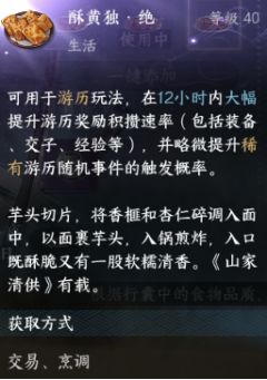 逆水寒手游的游历玩法,虽然是挂机性质的,但是我们也是有一定的概率去获得优秀的物品。而怎么能提高这个概率呢,除了玄学,个人认为和添加烹饪的级别是有一定关系的。
