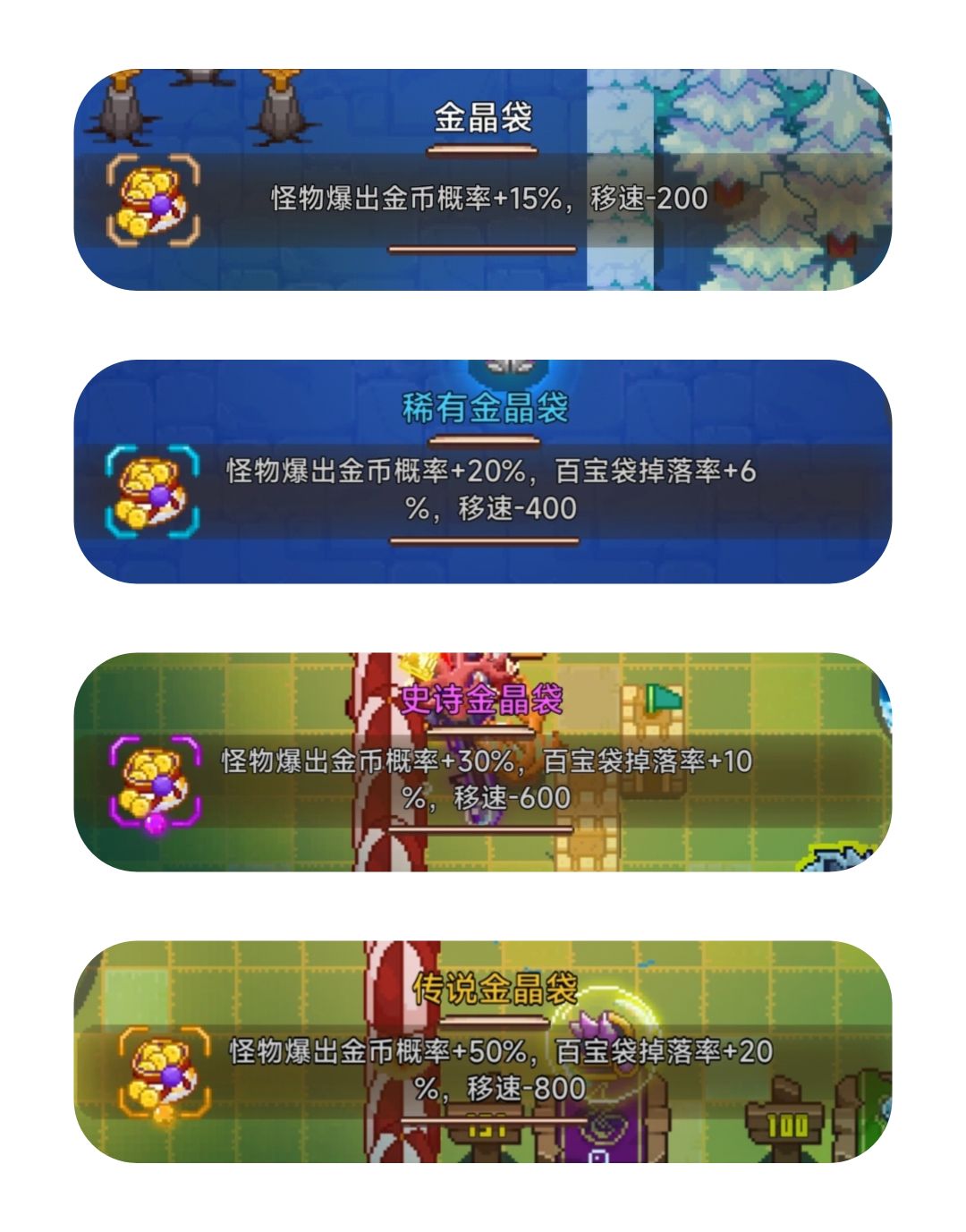 金晶袋:增加金币、百宝袋掉落率,减移速
