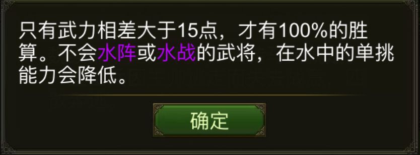 小技巧:张任和张绣对单挑有隐藏加成,孙堅、孙策和甘宁在水中单挑旱鸭子(没水阵、水战和扬帆技能)几乎无敌,许褚是单挑翻车率最高的武将。