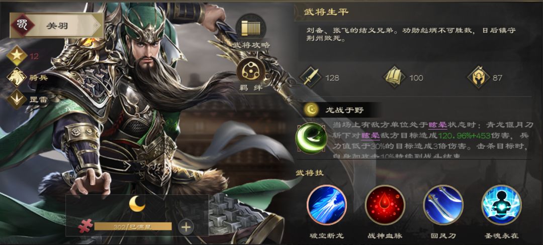 关羽游戏地位很高,作为《热血三国无双》中的人气武将,虽然随着新武将的不断推出,但关羽的出场率依然很高且实战能力非常不俗,关羽的被动【龙战于野】,当场上有敌方单位处于眩晕状态时:青龙偃月刀斩下对眩晕敌方目标造成大量伤害,击杀目标时还会增加自身攻击力持续到战斗结束,因此这大大增加了关羽的生存能力和应变能力,令其在多种场合中都能有上场的机会。