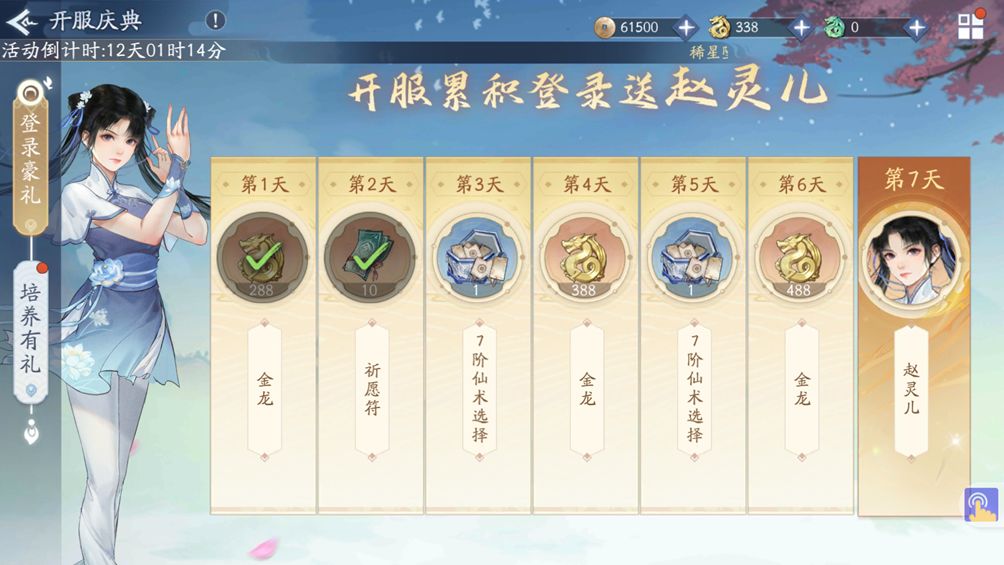 A. 开服庆典活动。此活动给与大量福利。务必全部完成。优先级别很高。请记住。除非欧皇,否贼这个雷系赵灵儿将是你首个需要培养满星的C。(此活动从开服当日算起,共持续14日)