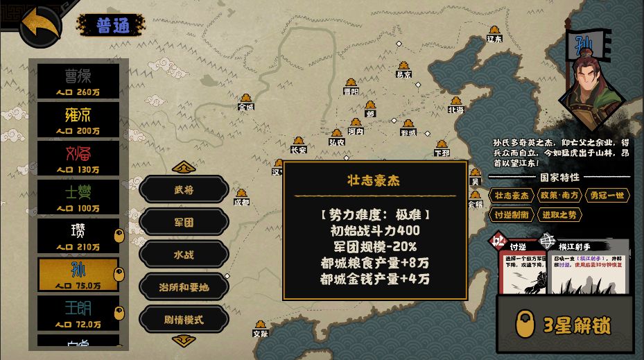 而其他一些初始比较弱小的势力,像是孙氏之类的势力,就会更难开局,会面临兵力匮乏、粮草紧缺的情况。