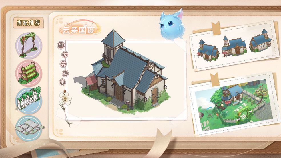研究实验室也称为凌云的家,与朵朵的云上小屋不同,在采用深棕木色的门窗设计外,搭配了高级灰墙体和瓦蓝屋顶,蓝色基调与科研工作的严谨细致映衬,来自地球的居民当然要好好款待,独立空间和花圃是必不可少的,当然,小云朵有什么更好的建造搭配吗?