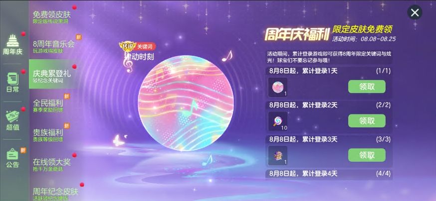 共贺周年庆,全民领福利!八周年庆典期间,只要登录游戏,即可领取超大宝箱钥匙、炫彩棒棒糖等超多惊喜奖励~奖励随着球宝的过往赛季数量逐步加码,记得前来领取哦!