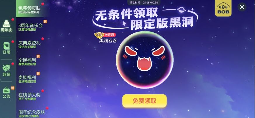 八周年限定传说皮肤「黑洞吞吞」无条件送,穿上它,成为八周年庆典最炫的球宝吧!