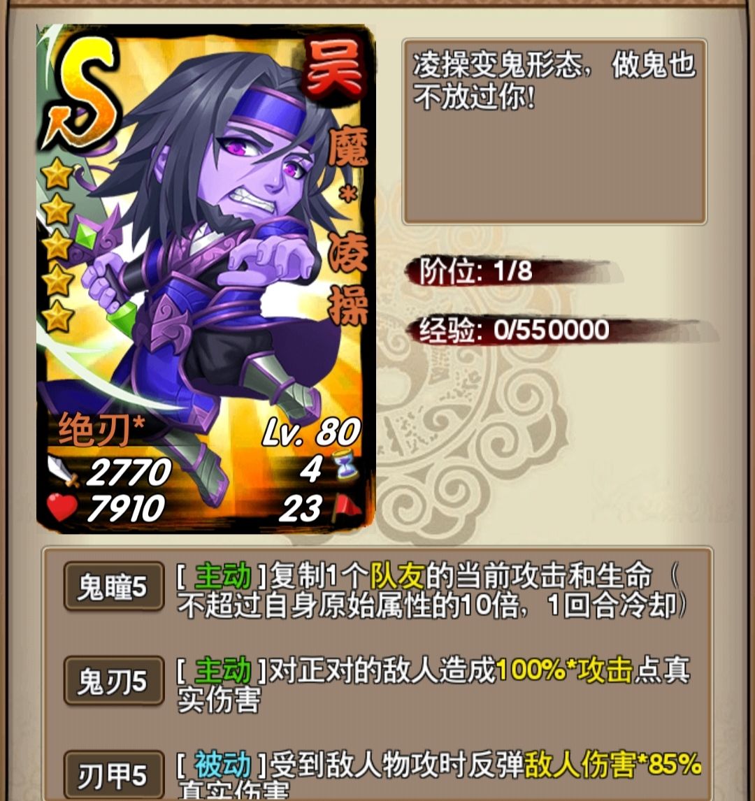 凌操是一个竞技武将,本体是一个非常优质的狗粮,死后会留一个很凶悍的分身,本身是四速卡上场满,但是上场会眩晕全体敌人并且修墙,只要在他上场之前不被爆菊就行。分身技能如下