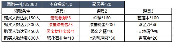 【活动简介】活动期间内,道友们可购买活动界面的团购商品。当购买团购商品的人数达到一定数量时,购买过该商品的道友们可以额外领取相应奖励。