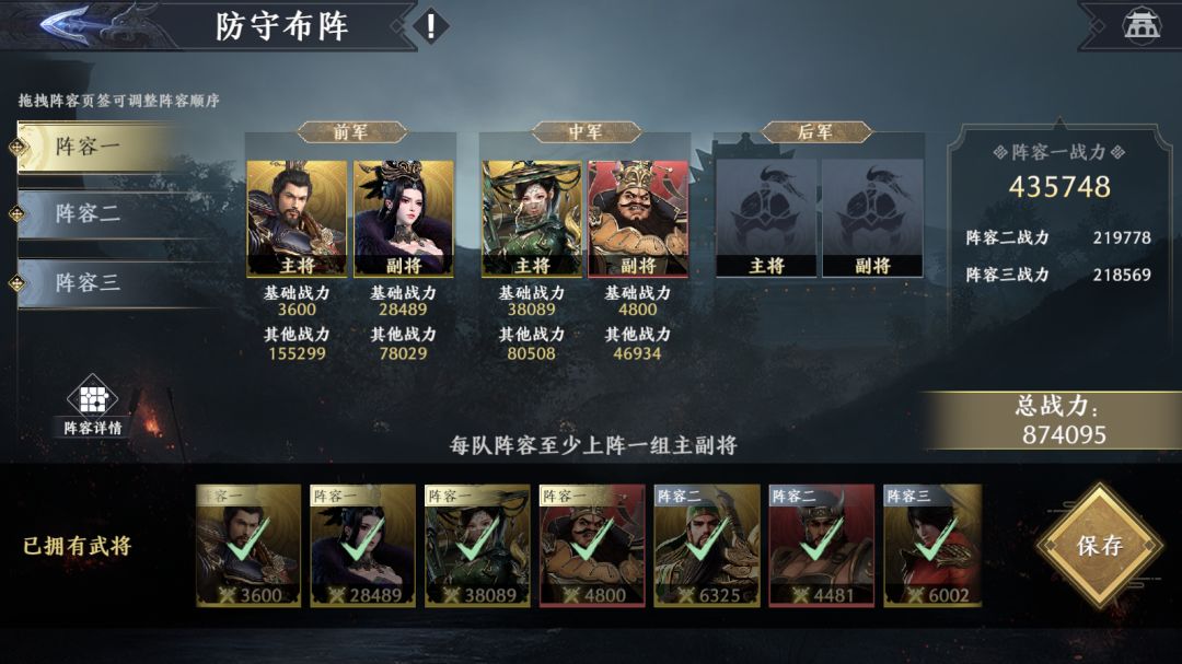 进入玩法页面后,将军需先设置防守阵容方可参与玩法。防守阵容一共有3队阵容,每队阵容分为前、中、后三军,将军可自由选择出场的武将,不过若一名武将在其中3队阵容中的任意一个阵容出场,则无法再在其他阵容中出场。其次,每队阵容不强制满编,只需最少上阵1组主副将即可。