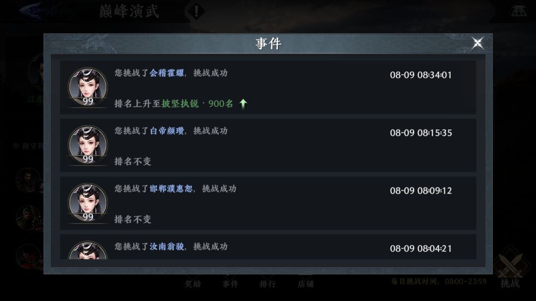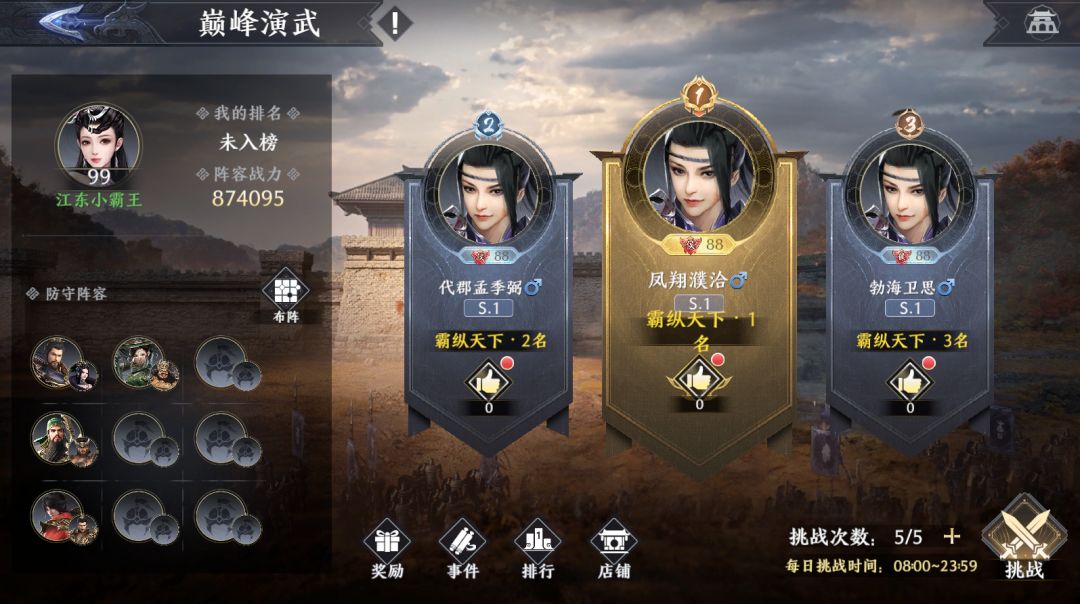 除了主动的挑战外,将军也可能会被他人挑战,若被他人挑战成功,将军的排名将被对方替换,排名下降后,将军可继续通过战胜高排名将军提升自身排名。以上这些挑战记录都会记录在事件中,以供将军查阅。
