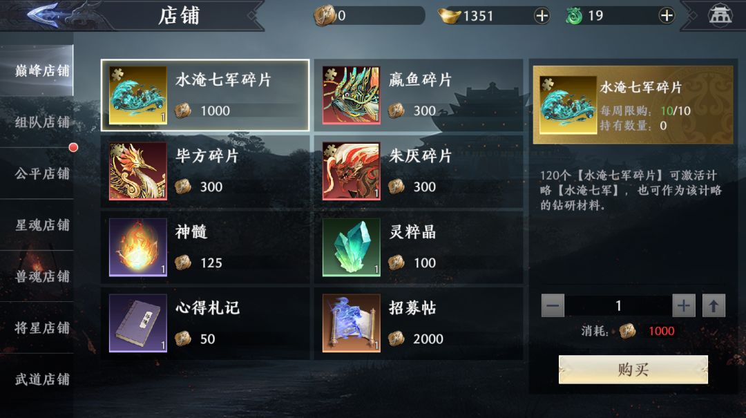 奖励方面,巅峰演武主要会产出大量的巅峰币,巅峰币可以用于兑换巅峰店铺中的珍稀道具,比如金色计略碎片、神兽碎片等。另一方面,积极提升个人排名和段位,还可以获得丰富的神兽养成道具灵草以及彩金坐骑昆仑镜灵碎片等,另外每日为排名最高的三名将军点赞,还可获得额外奖励哟~
