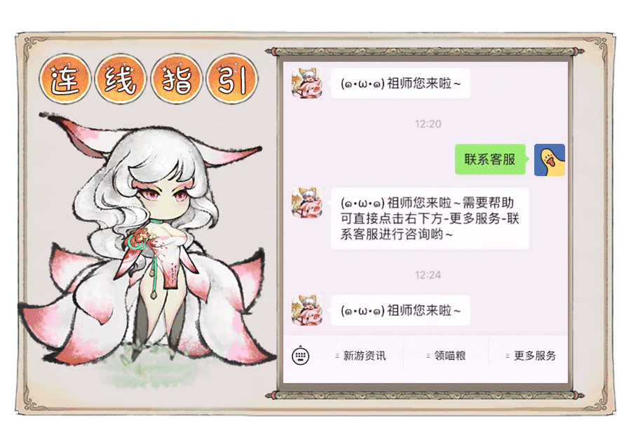 连线指南关注《最强祖师》公众号,在对话框菜单栏点击【更多服务】—【联系客服】,即可与猫妹、猫弟嗨聊~