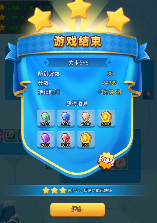 只需要按照上述思路摆放和升级炮塔,3倍自动即可轻松过关,过关5-6关卡总耗时13分钟6秒,整体难度不大。
