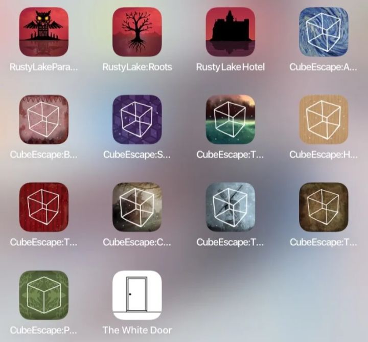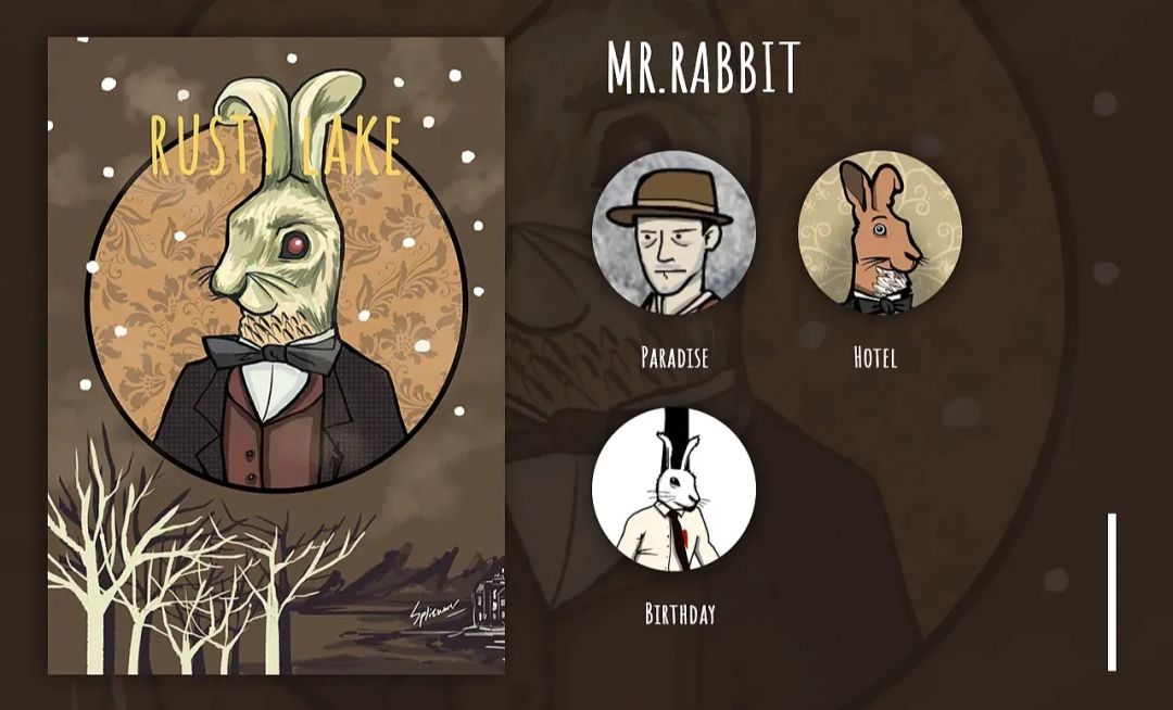 1893年-《锈湖:旅馆》(Rusty Lake:Hotel)锈湖旅馆最初出现在锈湖湖畔。这是个奇怪的旅馆。早一批的无名客人受邀前往锈湖旅馆,分别是鹿、兔、鸽、鸡、猪。他们都是恶名昭著的存在,哈维(就是玩家视角、在后作中可以猜到就是鹦鹉)杀掉了所有客人,并把他们的记忆提取成了黑色立方。囚禁在锈湖湖底。
