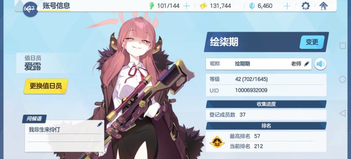 官服第一竞技场最高57名,然后可以稳定在100名左右,今天已经领了87名的工资了所以就给后面的人挖矿了,目前氪了800多,运气差,开局刷十连单伊织和阿露真纪双彩我选了双彩,等10号阿露池子再补个一井。