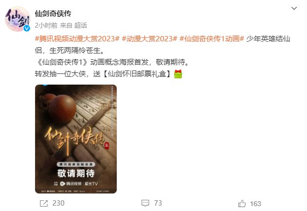 近日,《仙剑奇侠传》官方微博发布动态,表示《仙剑奇侠传1》将动画化,同时发布了一张概念海报,并配文“少年英雄结仙侣,生死两隔怜苍生”。