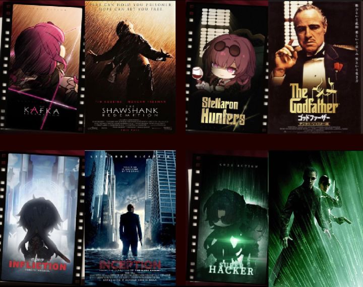图鉴的第一幕——《星核猎手》,左下角英文为Stellaron Hunters。图片中,卡芙卡饮酒对应教父饮酒的动作。银狼吐槽:你看,我就说和雨天没半点关系吧。对应活动的情节,也暗示教父中的雨天情节。右边的文字——永远不要让别人知道你的真实想法。出自《教父》经典片段。