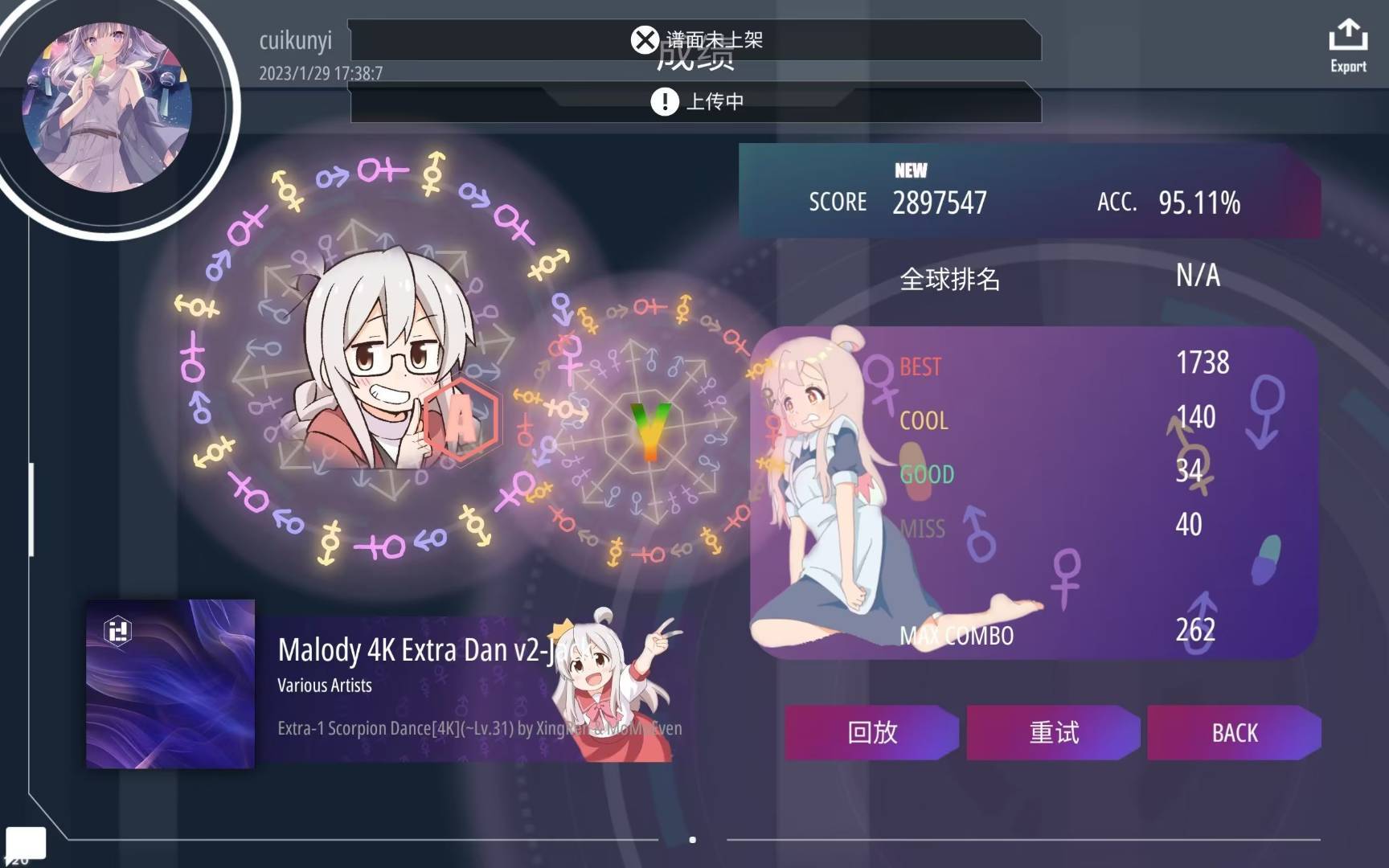 不只是断触,而且还容易莫名其妙爆g,我自己对于我的游戏水平还是有点自信的,毕竟玩过一段时间4k,但是很奇怪这首歌,特别特别容易断不管是平板还是手机,感觉好像优化没做好,还有就是除了Miss,其他最好不要影响连击个数,会影响手感就像这首歌,只有一个miss,但打的时候感觉像是全miss,