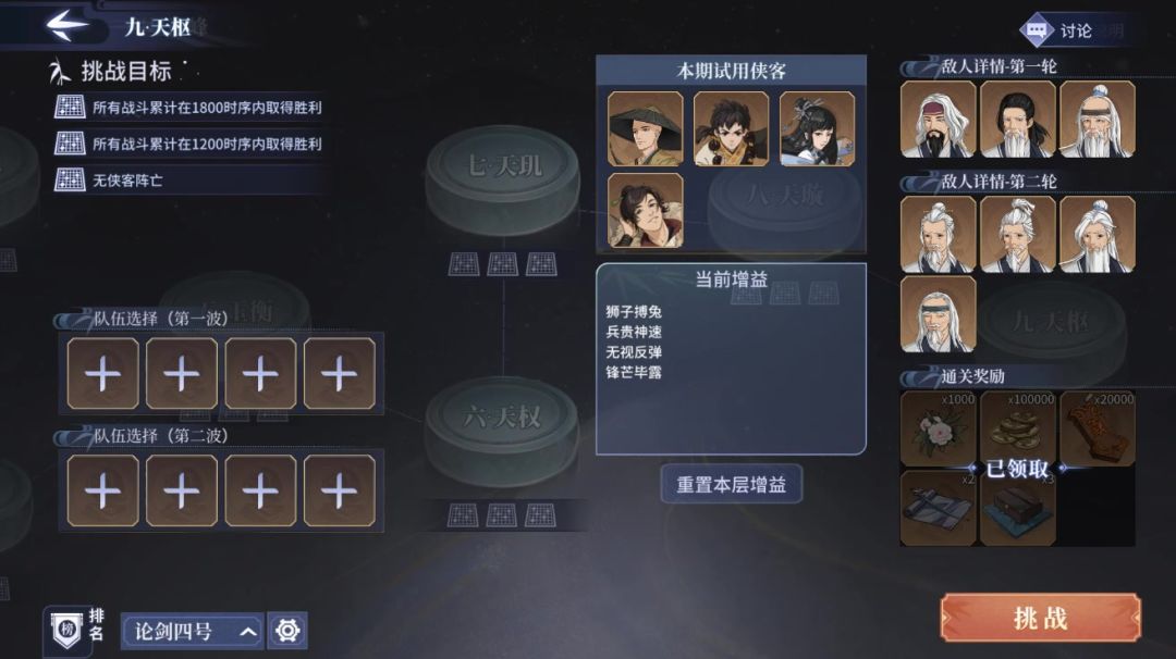本次活动难度对于低资源或萌新玩家很不友好,给的试用侠客35级的,跟没有有啥区别,这种设计意义何在?boss的实力很强悍,尤其是在7至9层,很多玩家都卡在这块了。主要是要求比较苛刻,想拿满奖励,需要满足累计时序不超过1200,且不能有侠客死亡。