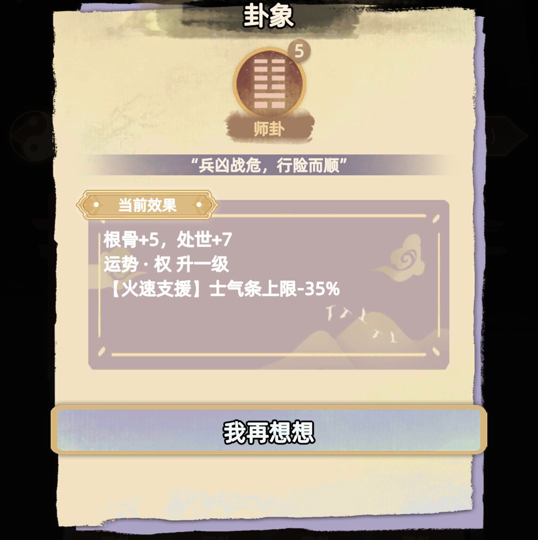 可以看得到,即使是红色功法吹一次也只是加70-80士气,虽然加上自然增加的士气可能也能达到100,但是橙色功法、紫色功法就不一定了,这时候我们在天赋卦象上选择——师卦。