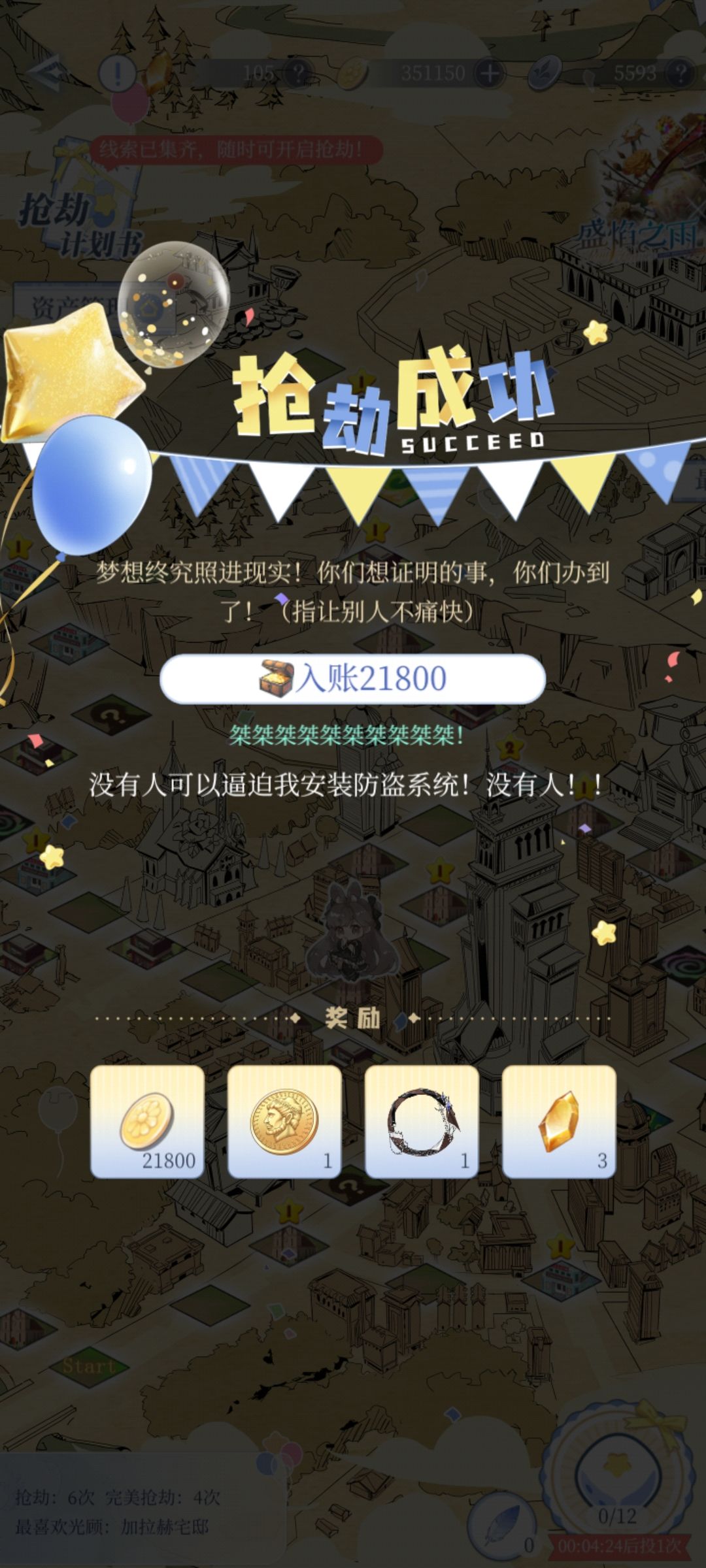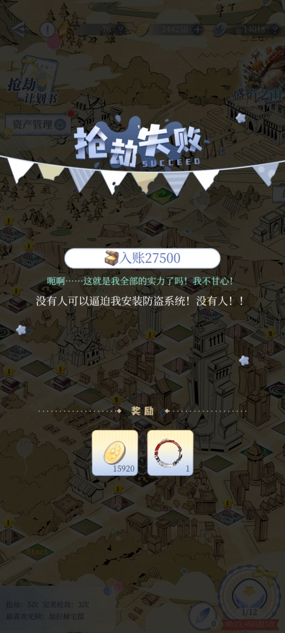 ⑥抢劫了8次,成功6次,貌似温因的大别墅最有钱,被我抢到4w多,莱恩和列夫只有2w多,加拉赫家3w多,布鲁斯我不太记得,应该不多。