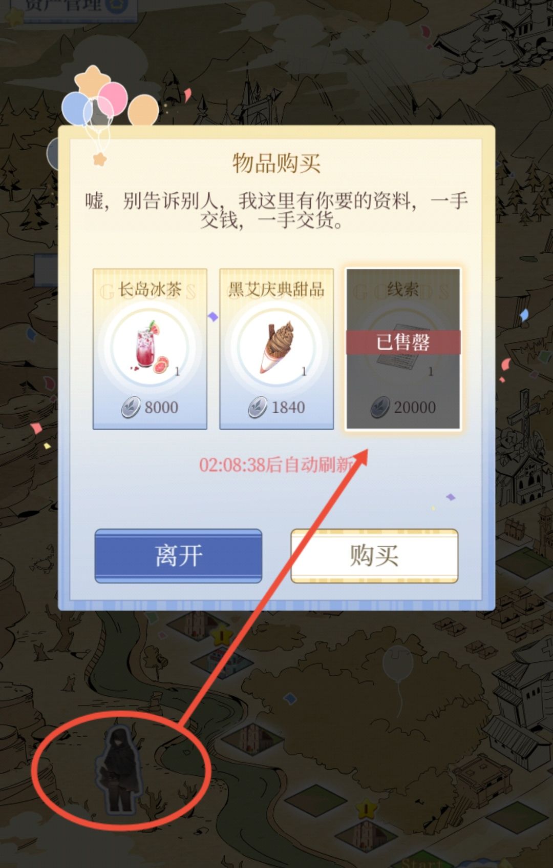 ②规则上,可以从黑衣人🧛♂️那里买到线索,售价2w游戏币,所以一定要多多搞钱,不然等到黑衣人刷新卖线索时,没钱买就很尴尬。