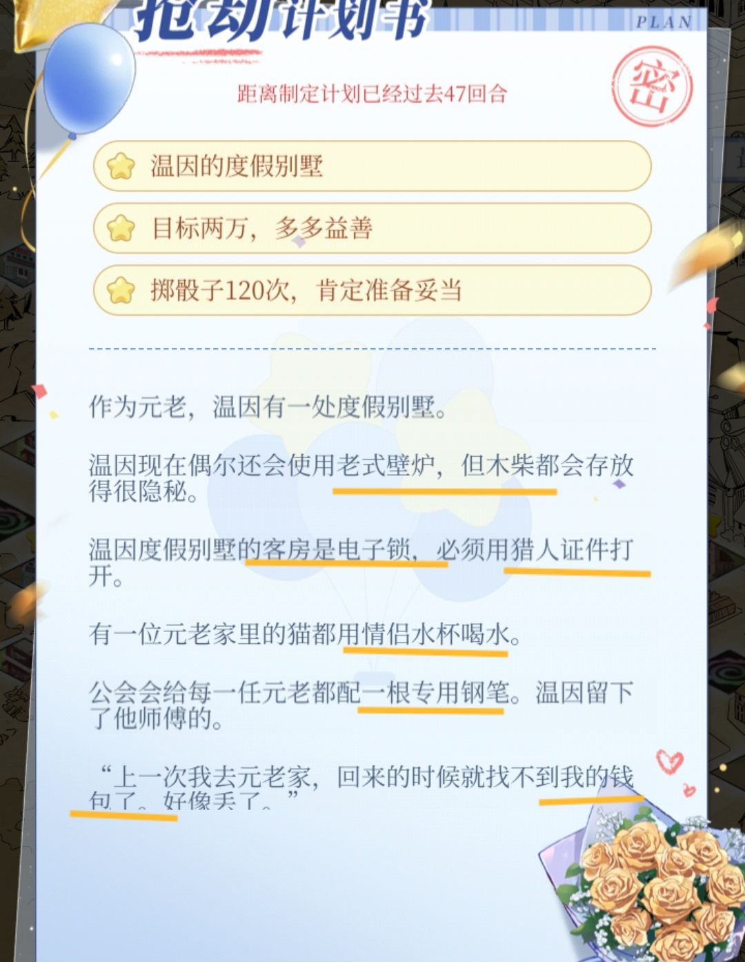 ⑦❗️关于线索的补充❗️:替大家试过了,线索不齐太容易失败了!抢劫加拉赫,我只少了1个线索,结果只找到69%的东西🤕🤕🤕。第二次重开,破案了,那个线索应该是关于房间的信息,我没收集到,所以抢劫的时候一整个房间都没出现😢😢😢,而那个房间恰好有很多值钱的东西……(这也说明,虽然有的线索是无用的信息,有一定的几率没集齐开抢可以成功,但赌的成分太大了。)