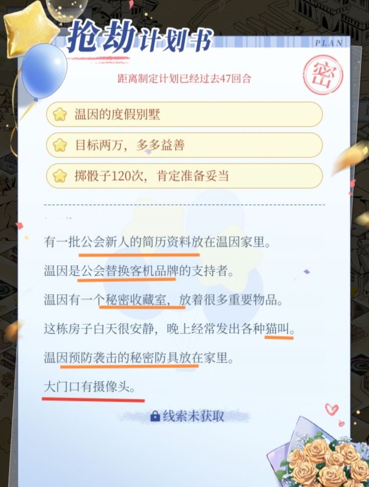 ③线索📝的作用,在于能不能找到物品。我目前推测,可能只有线索出现了,抢劫时相应的物品才会出现,不然很难达到100%成功。(后续在⑦中证实,我的猜测是对的😢)