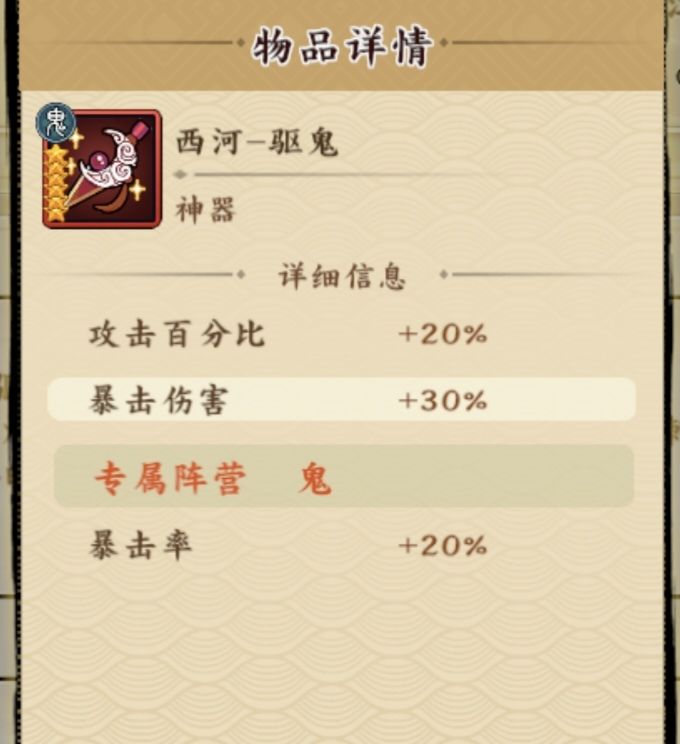 神器选择专属鬼神器西河驱鬼,提高暴击和暴伤