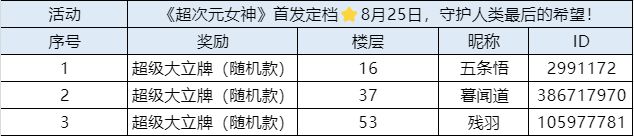 我们将会在成功参与活动的玩家中,抽取3位玩家,各送出《超次元女神》超级大立牌(随机款)1份!