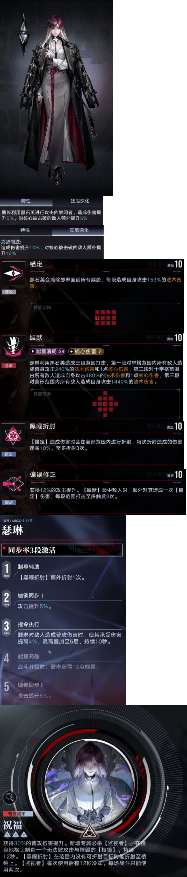 简评:极其合格的法队副C,技能组优秀,而且可以走A补伤害,凡是适合走A的输出对萌新都很友好,毕竟练度不够手速凑。