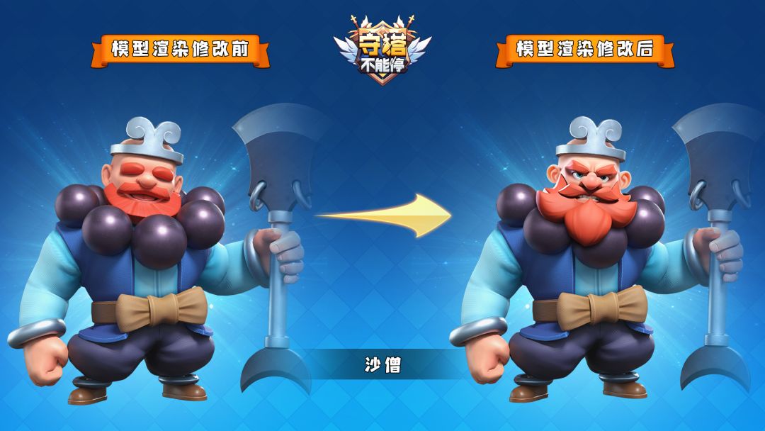 本次对沙僧的形象升级主要体现在气质改变上。众所周知在西游记中,沙僧皈依佛门之前,由于打碎琉璃盏被贬下流沙河,每每要遭受飞剑刑罚。因而性格暴戾、面容十分凶恶。旧版形象中沙僧的形象气质显然过于憨厚了,因此新版沙僧在形象上采用了更加狂野的设计。