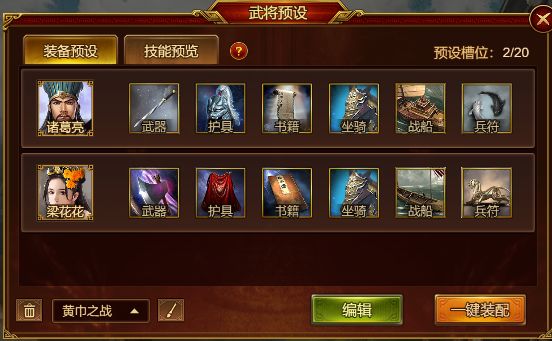 选择右下方【军团】-【预设装配】,即可在战役中直接使用【点将台】的武将预设。