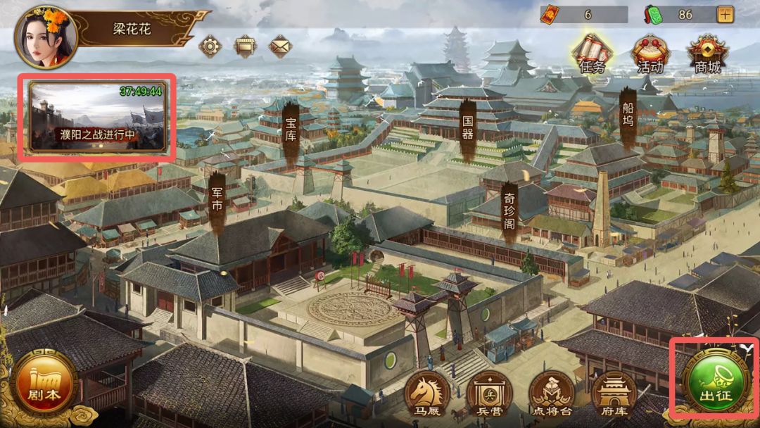 活动开启后,主公可通过治所右下方的“出征”、左上方的提示框,或者游戏主界面战役入口进入活动界面。