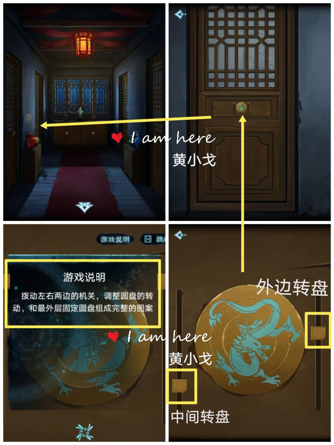 7.(二楼走廊)点击左侧右边房间的门,点击门上的密码锁,查看游戏说明,完成小游戏(拨动两边的滑块,转动转盘,左边滑块控制中间转盘、右边滑块控制外边转盘)