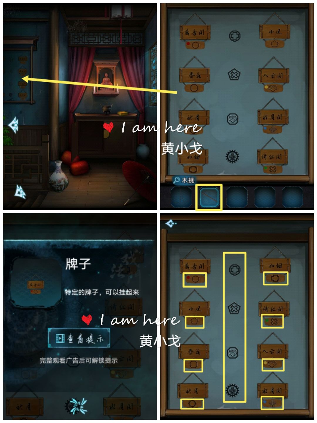 6.点击墙上放房牌的地方,使用【木挑】,第一个牌子不能动,注意观察规律,把牌子放到正确的位置上(左边是中间图案的外面,右边是中间图案的里面),获得【牌子】