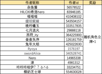 在所有符合要求的作品中,根据质量和热度等因素综合考量,选出10位老师奖励648元现金和随机角色立牌*1