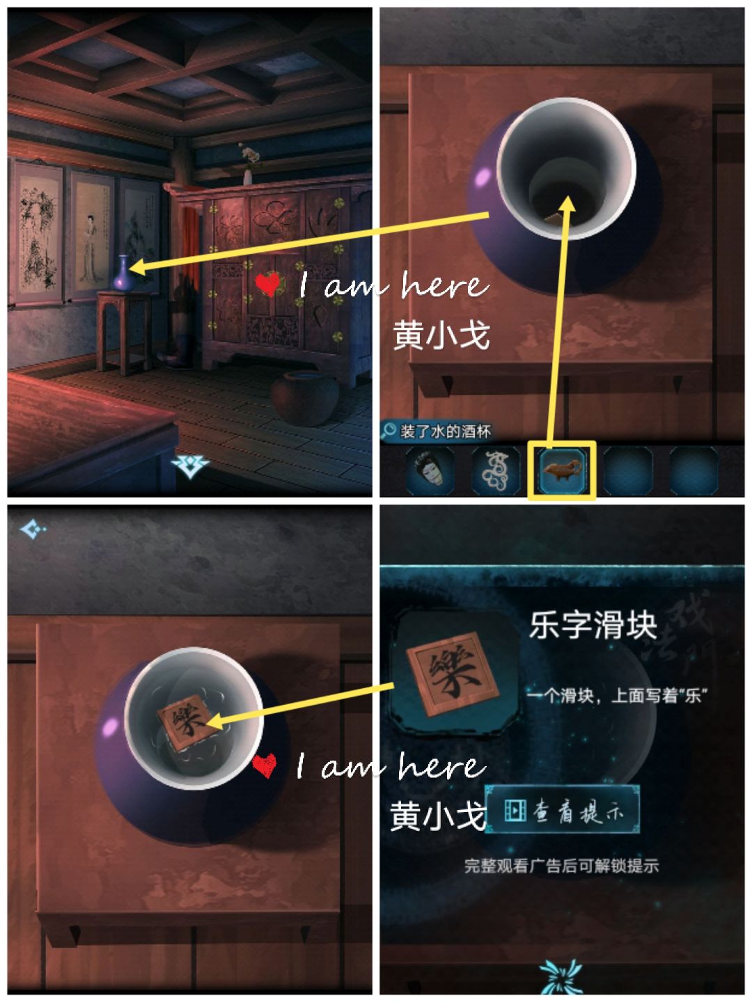 15.点击紫色花瓶,用【装了水的酒杯】倒入水,获得【乐字滑块】