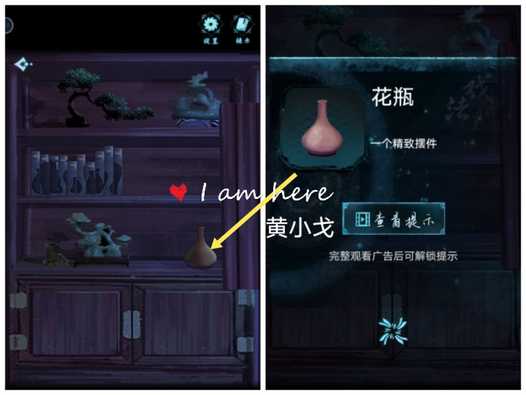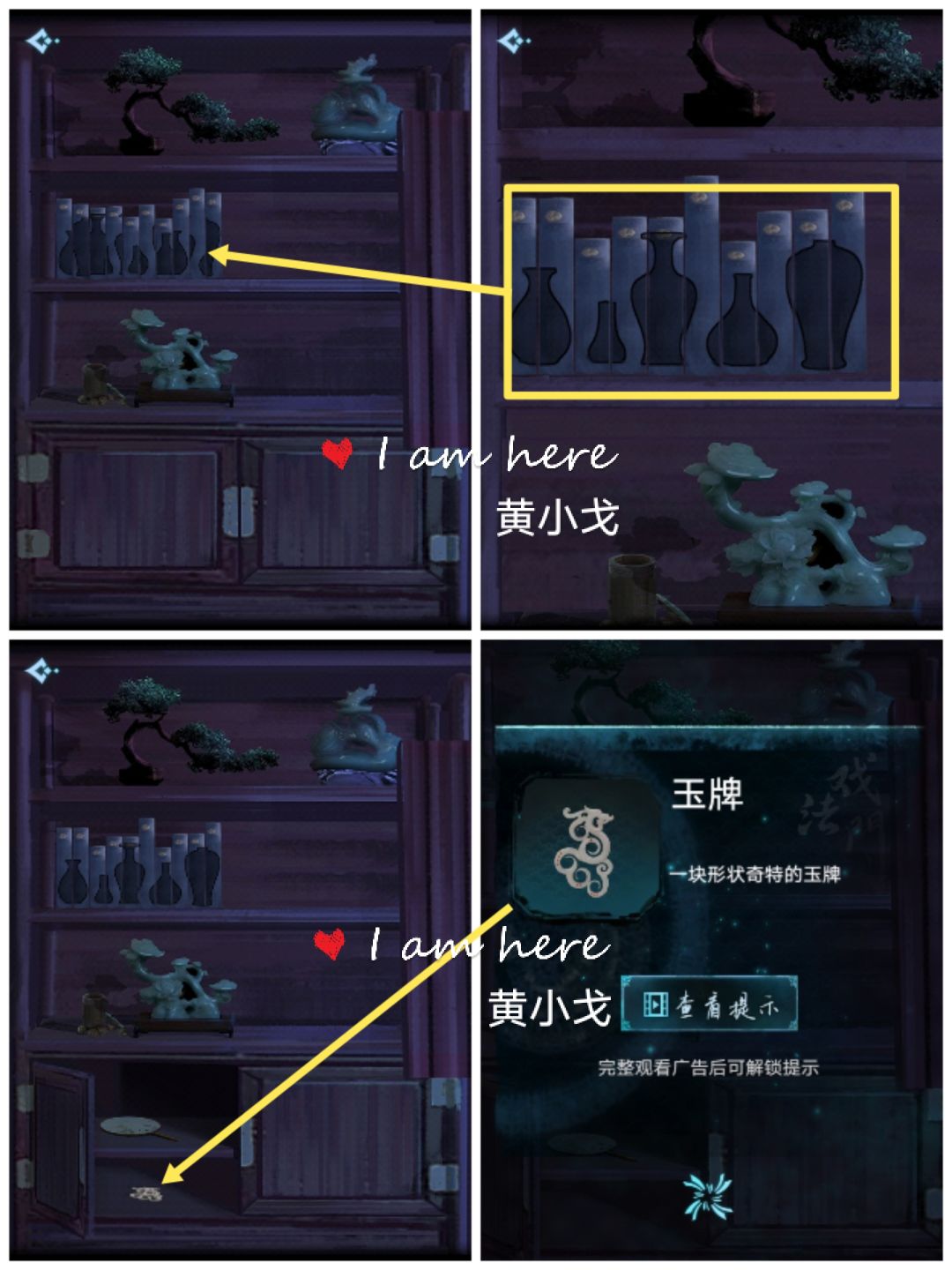 11.点击书,排列组成图案,柜子打开,获得【玉牌】(注意看花瓶样式及顺序)