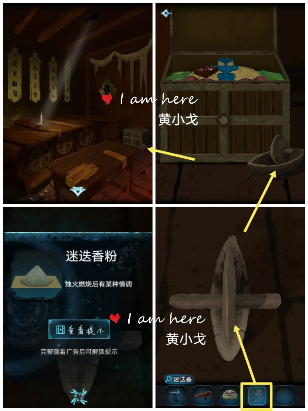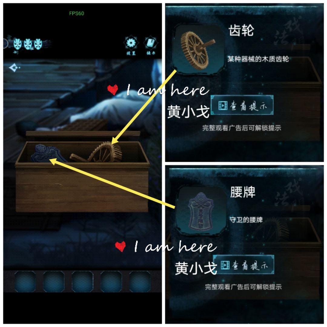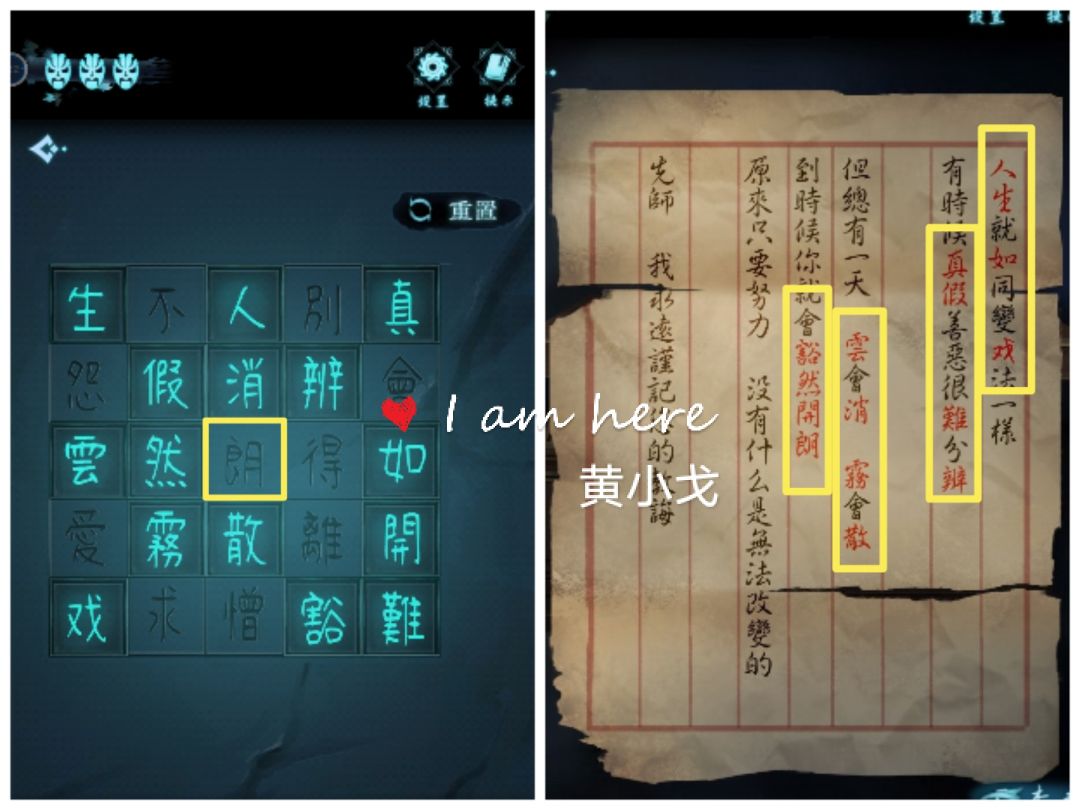 15.打开木盒,查看里面的信,获得线索(圈红的字:人生如戏、真假难辨、云消雾散、豁然开朗)