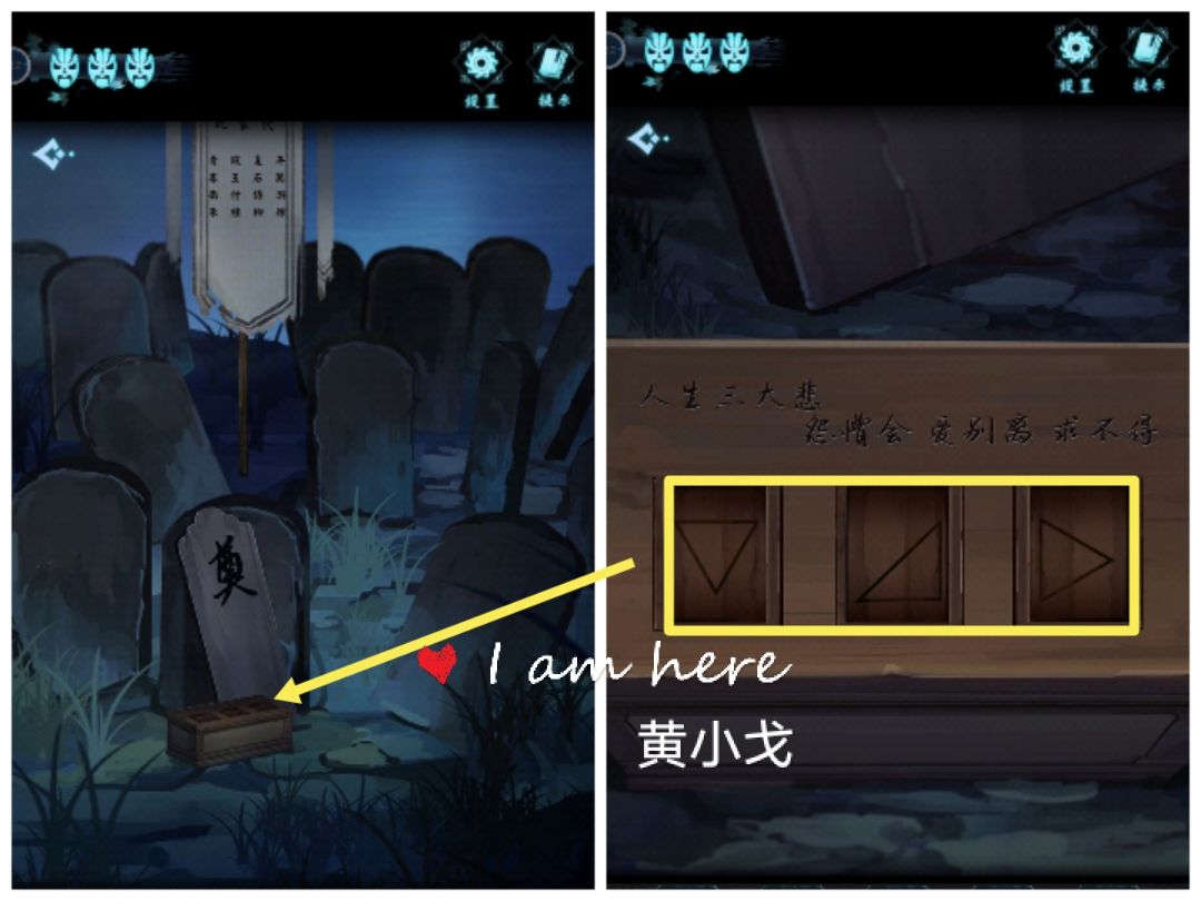 14.(奈何桥)点击木盒,根据上面的字,结合石壁上的线索,调整至正确的三角形