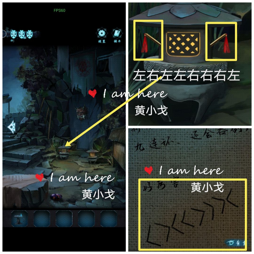 7.(孟门渡-右)点击左边的石灯,根据桌布上的线索,按(左右左左右右右左)的顺序点击棍子