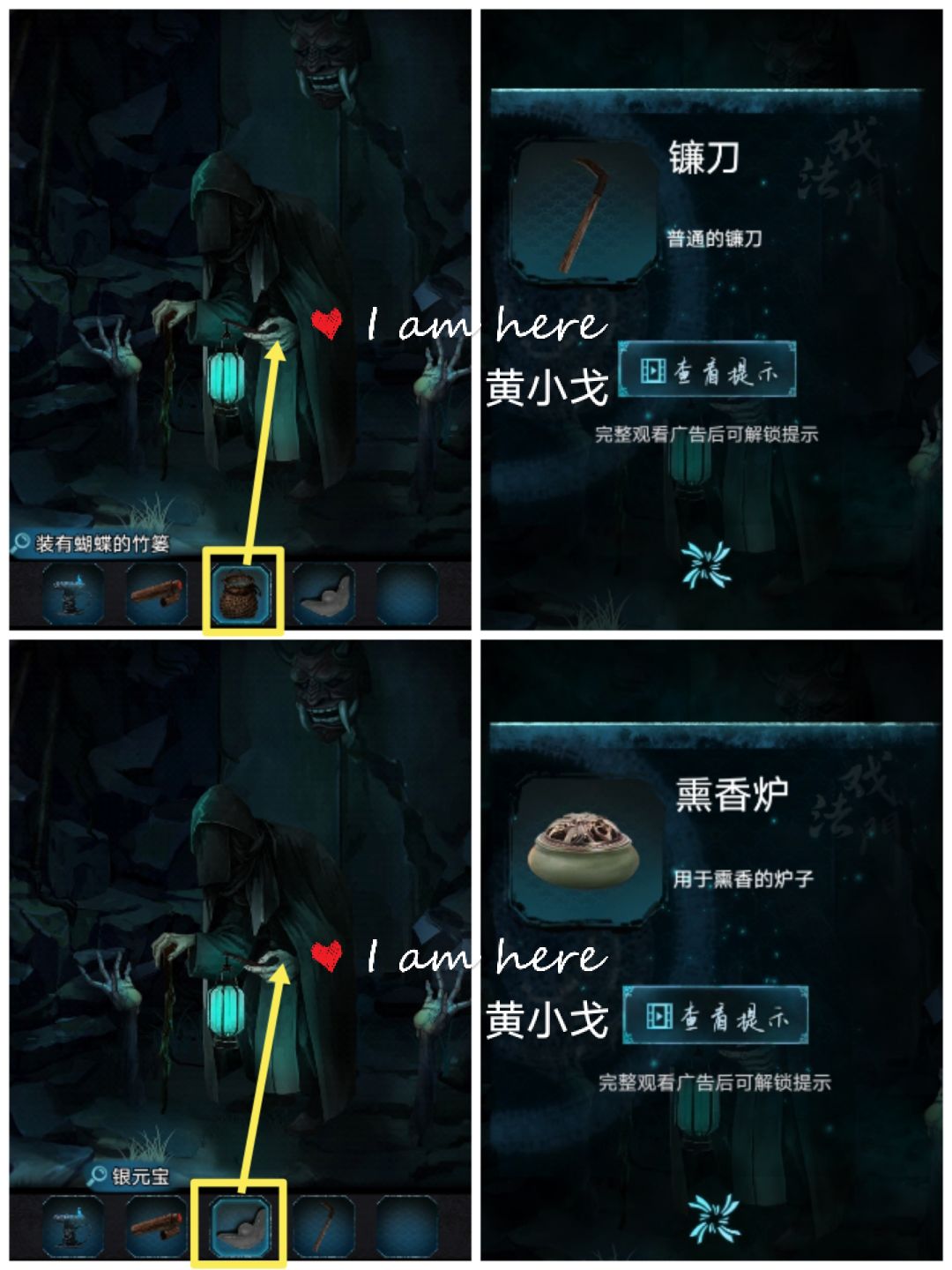 2.(鬼门关-右)拿【装有蝴蝶的竹篓】给人,获得【镰刀】,拿【银元宝】给人,获得【熏香炉】