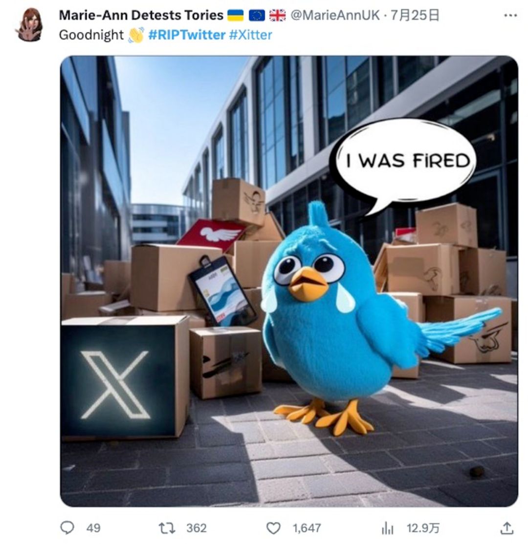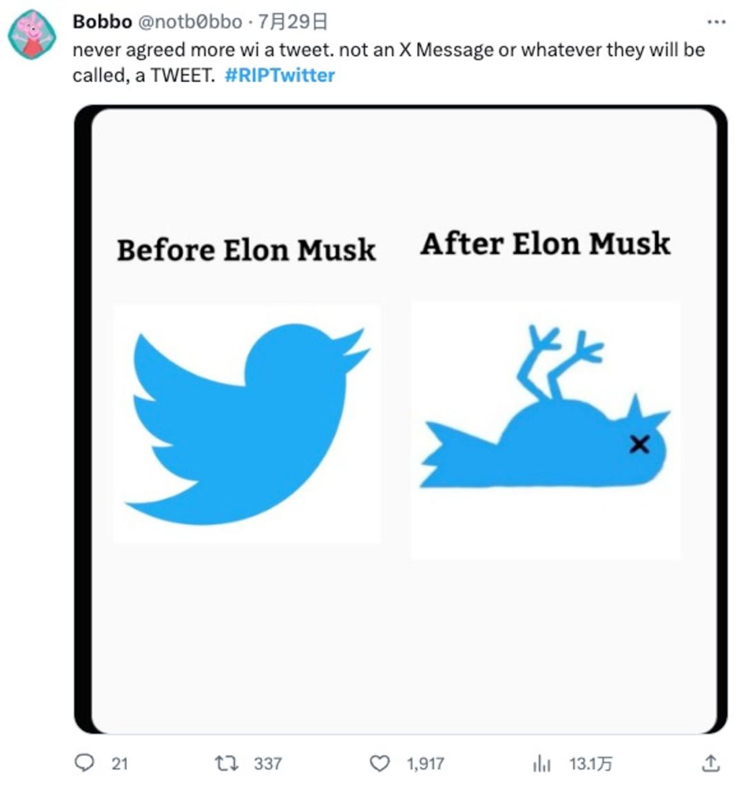 换了老板的推特遭了大罪,其中最显眼的变化莫过于更换标志。2023年7月24日,小蓝鸟死了。