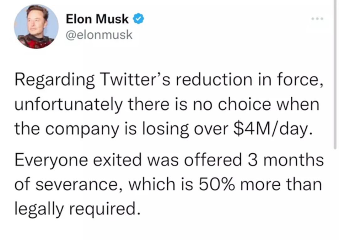 成为超级应用的第一步,就是精简人员。收购完成时,推特拥有2700名固定雇员。自上市以来,仅有2018、19两年实现盈利,剩下的时间都在亏损。在完成交易时间点,推特每天亏损400万美元。所以,马斯克前一天还去推特总部,和自己的新员工交杯换盏,转头就痛定思痛,要进行一波人员汰换。