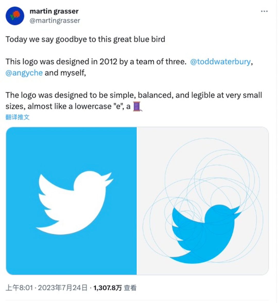 要说此次换标风波中,最难过的人,应该是曾经设计出这个标志的推特前设计师martin grasser。他当时领导的三人小组,负责了这版标志的设计。设计灵感来源于蜂鸟振翅的样子,但并不是任何自然鸟类的侧写。结构上像一个小写的a或者e,即使在非常小的地方,依然有清晰的辨识度。从接下需求开始,三个人总共画了1000多只鸟,最终有24只鸟进入总决选阶段。这只小蓝鸟其实是由15个圆圈以黄金分割构图法交叠而成,每一个侧面,包括喙,都是由精确几何的圆弧画成的——你可以在下面的切线图中看到具体的构成。