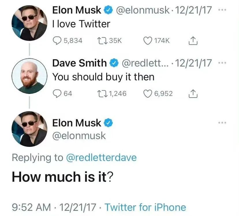 时间回到2017年,马斯克说,我喜欢推特,有好事网友说,你应该买下它。五年之后,22年4月,马斯克对推特的收购正式完成。