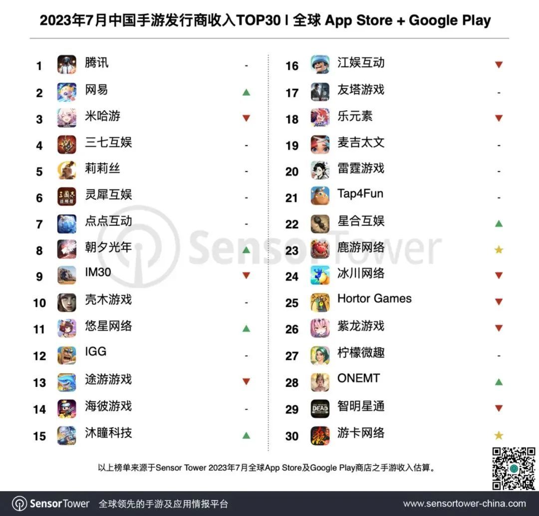 今日(8月9日),Sensor Tower发布了2023年7月中国手游发行商在全球App Store和Google Play的收入排行TOP30(以下简称TOP30,仅统计发行商收入,且不包括中国地区第三方安卓渠道)。