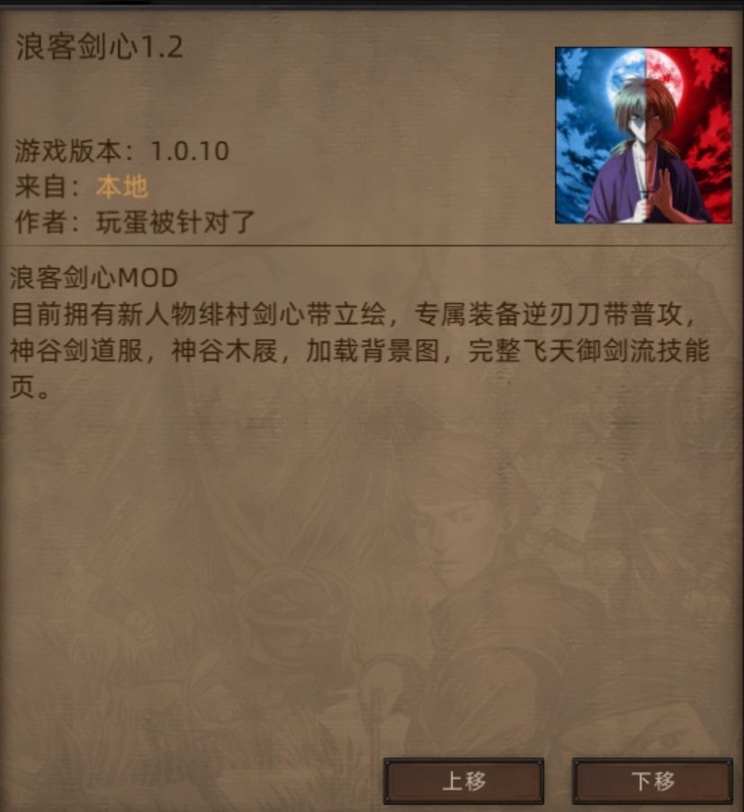 模组拥有新人物绯村剑心带立绘,专属装备逆刃刀带普攻,神谷剑道服,加载背景图,完整飞天御剑流技能页。