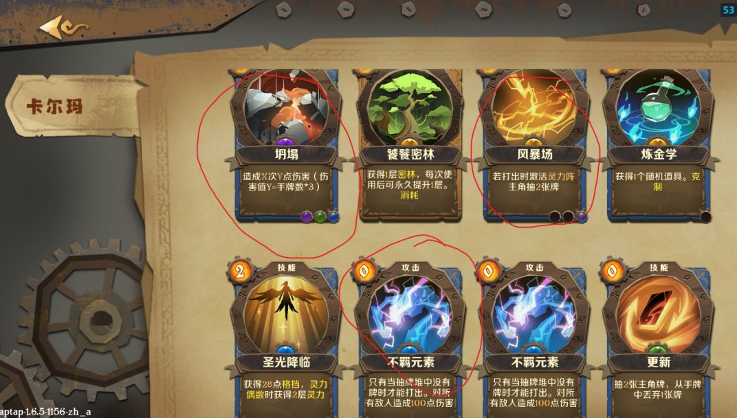 只要红圈里的3张卡,坍塌初始送的,不羁元素解锁后一大堆,这套路唯一高的要求就是“风暴场”,金卡,有点难遇到。