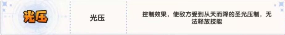 [光压]是一个类似沉默的控制技能,虽然介绍跟沉默看起来差不多,就是高大上一点(bushi),但其实作用也跟沉默一样(啊哈哈)。目前能解除[光压]效果 的手段只有春风四层【净心】和莎雅娜的进化,光这一点就比沉默厉害多了吧~